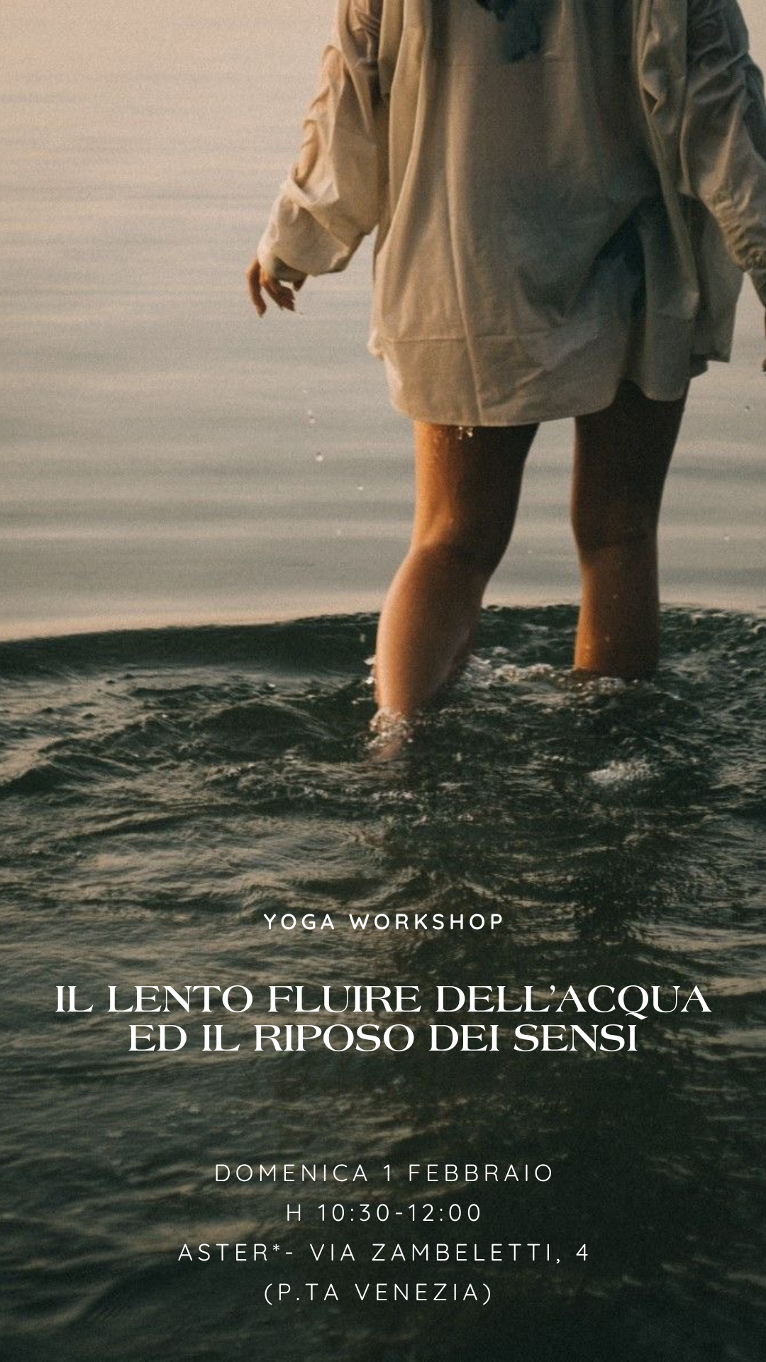 Ci muoveremo poi sul tappetino come acqua, andando a risvegliare le correnti che scorrono dentro di noi. Lasceremo emergere le nostre sensazioni più profonde per poi riportare il nostro corpo in uno stato di apparente staticità e passività: andremo così a lavorare sui tessuti più profondi per favorire un profondo rilassamento.